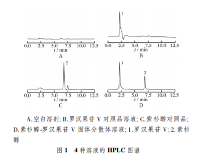 分別取空白溶劑、羅漢果苷 V 對 照品溶液、紫杉醇對照品溶液和紫杉醇-羅漢果苷 V 固 體分散體溶液,按“2.3.1”條件,進(jìn)行 HPLC 分析,紫杉 醇典型色譜圖見圖 1。結(jié)果表明,在本色譜條件下,紫 杉醇峰形良好,保留時間約為 6.8 min,空白溶劑和羅 漢果苷 V 對主峰的測定無干擾。