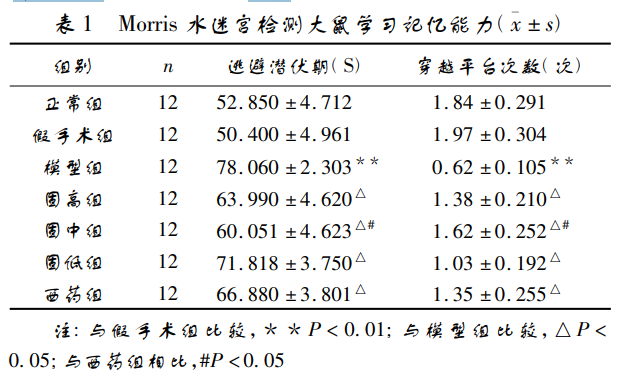 給藥結(jié)束后,采用 Morris 水迷宮實驗 檢測大鼠的空間學(xué)習(xí)記憶能力。實驗分為定位航行和空間 探查兩部分。向池內(nèi)注入凈水,以高出平臺 2 cm 為度,倒 入墨水適量,調(diào)試軟件,將大鼠面向池壁分別從四個象限固 定位置放入水中,記錄大鼠在 90 s 內(nèi)找到平臺的時間( 逃 避潛伏期) ,如未找到,則將其引導(dǎo)至固定平臺,停留 10 s, 使大鼠能觀察周圍環(huán)境,結(jié)束后將水擦干,保暖。連續(xù)訓(xùn)練 6 d,第 7 天進(jìn)行空間探查實驗,即撤去平臺后,按原方法將 大鼠都從任一以象限放入水中,記錄其第 1 次經(jīng)過原平臺 的時間、90 s 內(nèi)跨越原平臺次數(shù)等。