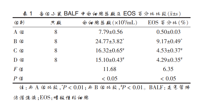 A 組小鼠氣道黏膜無增厚,氣道周圍無炎癥細胞 浸潤,肺泡壁結(jié)構(gòu)完整;B 組小鼠氣道黏膜充血水腫, 氣道周圍較多炎癥細胞浸潤,肺泡結(jié)構(gòu)被破壞;C 組 小鼠氣道周圍少量炎癥細胞浸潤,管壁無明顯增厚; D 組小鼠程度與 C 組小鼠相似。 見圖 1(封四)。2.3 各組小鼠 BALF 中白細胞總數(shù)和 EOS 百分比的 比較 與 A 組比 較,B 組小 鼠 BALF 中白 細 胞 總 數(shù) 和 EOS 百分比均顯著升高,差異有高度統(tǒng)計學(xué)意義(P < 0.01)。 與 B 組比較,C 組和 D 組小鼠 BALF 中白細胞 總數(shù)及 EOS 百分比明顯降低,差異有高度統(tǒng)計學(xué)意 義(P < 0.01)。C、D 兩組白細胞總數(shù)和 EOS 百分比比較, 差異無統(tǒng)計學(xué)意義(P > 0.05)。 見表 1。
