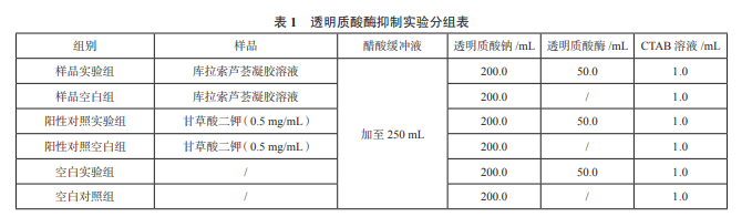 透明質(zhì)酸酶能將大分子的透明質(zhì)酸水解成低 分子化合物,未水解的透明質(zhì)酸會與十六烷基三甲 基溴化銨(CTAB)形成不溶物,而水解后的低分子 化合物不會。通過測定 405 nm 處的濁度值,可以 反映透明質(zhì)酸酶的活性。 實驗設(shè)置:將庫拉索蘆薈凝膠粉按照 16.5、 33、82.5 和 165 mg/mL 的質(zhì)量濃度進行分組,每 個實驗分組按表 1 進行操作。