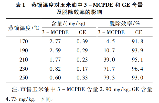 取進(jìn)油速度 160 mL /h、刮膜速率 240 r/min,在 蒸餾溫度分別為 170、190、210、230、250 ℃ 的條件下 對玉米油進(jìn)行分子蒸餾處理,玉米油中 3 - MCPDE 和 GE 的含量變化如表 1 所示。