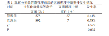 過氧化氫低溫等離子滅菌,屬于新型滅菌技術(shù),不僅環(huán) 保、安全,而且低溫、快速,應(yīng)用范圍廣,常常用于腔鏡器械、 微創(chuàng)手術(shù)器械與導管的滅菌處理,如關(guān)節(jié)鏡、宮腔鏡、腹腔 鏡、導航器材、光纖等。過氧化氫低溫等離子滅菌,要求每一 環(huán)節(jié)達到質(zhì)量標準,滅菌效果才合格。調(diào)查發(fā)現(xiàn),消毒供應(yīng)室 的工作人員對過氧化氫低溫等離子滅菌認識程度不深,雖然 了解一些關(guān)于滅菌方法、滅菌物品及過氧化氫濃度等方面的 知識,但掌握不夠全面,滅菌質(zhì)量控制相對模糊,滅菌循環(huán)中 斷事件頻頻發(fā)生。本次研究發(fā)現(xiàn),品管圈實施后滅菌循環(huán)中 斷率為0.78%,明顯低于品管圈實施前的6.41%(P<0.05)。由此 可見,運用品管圈活動進行質(zhì)量管理,可降低過氧化氫低溫等 離子滅菌循環(huán)中斷率,值得在臨床推廣應(yīng)用。