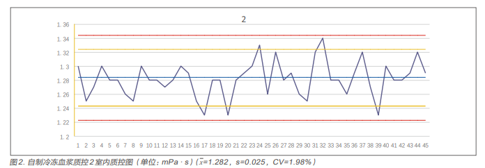 先將SA-7000血流變儀進(jìn)行日常的維護(hù)、清洗和保養(yǎng), 對血漿黏度做定標(biāo)校準(zhǔn),取上述兩份分別編號為質(zhì)控1和質(zhì) 控2的自制冷凍新鮮血漿各5mL,二者各重復(fù)測定20次,經(jīng) 過統(tǒng)計學(xué)處理,分別計算出它們的均值x及標(biāo)準(zhǔn)差s,作為 各自的靶值及靶值范圍。隨后每天取自制冷凍血漿質(zhì)控1和 質(zhì)控2各一支,置于37?C水浴箱中溫浴約15min,使其復(fù)溶 后立即取出。然后二者與當(dāng)天常規(guī)標(biāo)本一同檢測得出結(jié)果并 記錄。自制室內(nèi)質(zhì)控連續(xù)開展45個工作日并同時繪制質(zhì)控 圖表,觀察分析結(jié)果。