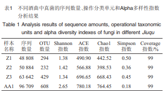 香農(nóng)(Shannon)指數(shù)、ACE指數(shù)、Chaol指數(shù)、辛普森 (Simpson)指數(shù)和Coverage指數(shù)是常用于描述微生物群落 物種多樣性的Alpha多樣性指數(shù),這5個(gè)多樣性指數(shù)可以對(duì) 群落物種組成的豐富度及群落物種組成的均勻度進(jìn)行綜 合性的評(píng)價(jià),5個(gè)多樣性指數(shù)中的Shannon指數(shù)對(duì)微生物群 落物種多樣性更為敏感。其中,Shannon指數(shù)越大,群落物 種的多樣性越高;Chaol指數(shù)或ACE指數(shù)越大表明群落物 種豐富度越高;由Coverage指數(shù)可知本次實(shí)驗(yàn)的取樣是否 合理,若Coverage指數(shù)>97%,則證明本次取樣是合理的;但Simpson指數(shù)值越大,說明群落多樣性越低。基于高通 量測(cè)序技術(shù)對(duì)濃香型白酒中高溫曲和芝麻香型白酒高溫 曲中真菌的序列數(shù)量、操作分類單元(operational taxonomic units,OTU)和Alpha多樣性指數(shù)進(jìn)行研究,結(jié)果見表1。