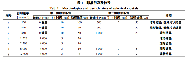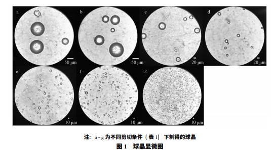 在不同剪切條件下制 備球晶,于顯微鏡下觀察所得產(chǎn)物粒徑及形狀,結(jié) 果見表 1、圖 1。由此可知,通過控制工藝條件可 制得粒徑 5 ~ 100 μm 之間的球晶,剪切速率較低 時,生成部分不規(guī)則形狀結(jié)晶; 剪切速率過高 ( >10 000 r/min) 時可得到初乳,但在固化過程 中乳 滴 破 裂,未能聚集成球晶,而 是 得 到 簇 狀 結(jié)晶。