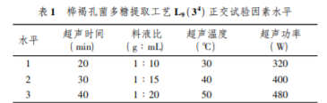 設計樺褐孔菌多糖提取物單因素試驗的變量條件分別為: 提取 溫度,20、30、40、50、80 ℃ ; 提取時間,10、20、30、40、50 min; 料 液比 1 g ∶ 8 mL、1 g ∶ 10 mL、1 g ∶ 15 mL、1 g ∶ 20 mL、 1 g ∶ 25 mL; 超聲功率,160、320、400、480、640 W,從而來確定 正交試驗中各因素的水平。