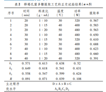 通過正交試驗確定樺褐孔菌多糖的最佳提取工藝。正交 試驗結果表明,影響樺褐孔菌多糖類物質提取率的因素主次 順序為 D > A > B > C,即超聲功率和超聲時間對樺褐孔菌多 糖提取效果影響相對較大,其次為提取溫度、料液比的影響。 綜合以上條件,樺褐孔菌多糖的最佳提取條件為 A2B2C1D3, 即按 1 g ∶ 20 mL 的料液比在溫度 30 ℃下提取 30 min,超聲功 率為 480 W,乙醇濃度為 30% 進行多糖含量測定( 表 2) 。 通過對正交試驗結果進行方差分析,來分析各因素對多 糖提取率的影響。結果表明,提取時間、功率、溫度和料液比 對提取率影響顯著( 表 2) 。