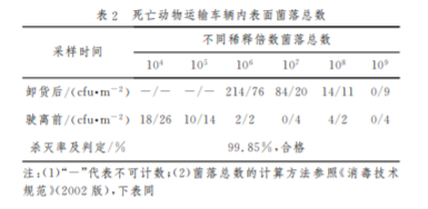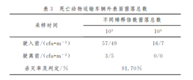 本報(bào)告選取1輛死亡動(dòng)物運(yùn)輸車輛監(jiān)測(cè)細(xì)菌殺 滅情 況,結(jié)果表明該車 輛內(nèi)表面細(xì)菌殺滅率 ≥ 90%,具體見表2、表3。