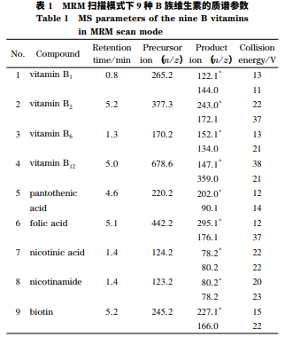 質(zhì)譜應(yīng)用技術(shù)中,流動相的選擇除考慮色譜的分離效果外還要考慮化合物的離子化程度,由于本 實驗選用電噴霧電離源、正離子模式,所以在流動相 中添加了甲酸。此外,有機相分別采用甲醇和乙腈 進行優(yōu)化,分析各種維生素的響應(yīng)強度,最終采用甲 醇作為流動相中的有機相。為了確定本實驗的 MRM 條件,依次將單一標 準品溶液(1. 0 mg / L)不經(jīng)過色譜柱直接泵入質(zhì)譜 中,在 ESI- 模式下,大部分維生素響應(yīng)較低;在 ESI+ 模式下,9 種 B 族維生素均能獲得豐度較高的母離 子,其中鹽酸鹽、鈣鹽等都會脫去鹽后以單一分子的 狀態(tài)離子化,得到[M+H]+ 峰,維生素 B12則為多電 子物質(zhì),滿足[M+H]+ / n 規(guī)律。確定母離子后,分 別對其子離子進行二級質(zhì)譜掃描,選擇豐度較高、干 擾較小的兩對子離子作為定性離子,豐度最高的離 子作為定量離子,然后優(yōu)化其碰撞能量。用 0. 1% (v / v)甲酸水溶液配制標準溶液,以各 B 族維生素的峰面積為縱坐標(y)、質(zhì)量濃度為橫 坐標(x,μg / L)繪制標準曲線。結(jié)果表明,9 種維 生素均具有良好的線性關(guān)系,相關(guān)系數(shù)(R2 )均大于 0. 999。以信噪比為 3 和 10 時的進樣濃度為最低檢 出含量和最低定量含量,根據(jù)樣品前處理過程,最終 計算得出該方法的檢出限為 0. 09~1. 67 μg / L。
