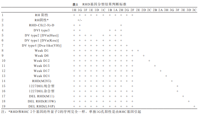 根據(jù)RH基因變異體基因分型檢測試 劑盒,在擴增儀上進行基因分型試驗。將將100μL dNTP-Buffer濃縮液、140μL去離子水 、2.0μL Taq 酶(5units/μL)和 2 5μL樣本DNA共267μL混合 液;向每個引物孔(1~24孔)各加入10μL上述混合 液。擴增循環(huán)參數(shù):96℃ 2 min ,1 cycle ;96℃20 S/68℃60S ,5 cycles; 96℃20 S/65℃50S /72℃45 S,1 0 cycles;9 6℃2 0 S / 6 2℃5 0 S / 7 2℃4 5 S,2 5 cycles; 72℃2min,1 cycle。吸取5μL擴增產物, 加入配制好的2%瓊脂糖凝膠中并進行電泳,電泳參 數(shù)設置為電壓100V,時間15min。電泳后用凝膠成像 儀進行拍照、記錄與分析。基因分型的結果判斷見表 1。