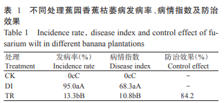 2. 1 生防菌XP1對香蕉枯萎病的防治效果