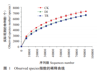 共測序獲得886890個序列,在97%的相似水平 下聚類后獲得61660個OTUs。測序結(jié)果顯示,3個樣品的所有優(yōu)質(zhì)序列經(jīng)聚類注釋后歸屬于40個菌門。 從圖1可看出,當測序深度達80000個序列時,各處理 的Observed species指數(shù)曲線趨向平緩,上升速度減 緩,說明測序深度已基本覆蓋樣品中絕大部分物種; 在同等測序深度上,無發(fā)病現(xiàn)象的CK處理實際觀測 到的物種數(shù)最多,當測序深度達70000個序列時,接 種致病菌的DI處理實際觀察到的物種數(shù)低于CK處 理、高于TR處理,隨測序深度的加大,接種生防菌的 TR處理其實際觀測到的物種數(shù)略高于DI處理、低于 CK處理。
