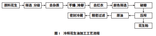 原料花生:將原料花生果首先采用剝殼機(jī)去殼; 篩選分級:脫殼后的花生仁通過初清篩、分級等過程。 去雜質(zhì):挑除花生仁中的石子、碎殼、灰塵等雜質(zhì); 干燥、冷卻:將脫殼后的花生放入低溫干燥烘箱進(jìn)行 烘干,然后進(jìn)行風(fēng)冷處理;去紅衣:烘干后的花生仁迅 速進(jìn)入風(fēng)冷并去除紅衣;顏色篩選:去除黃斑、霉變、蟲蛀及未完全脫紅衣的花生;破瓣后壓榨:將脫紅衣后 的花生破瓣調(diào)節(jié)水分后送入壓榨機(jī)中進(jìn)行壓榨;原油 過濾:冷榨毛油經(jīng)過濾得到純凈的冷榨花生油;密封 冷藏:過濾后的花生油經(jīng)過密封后冷藏,待檢測。
